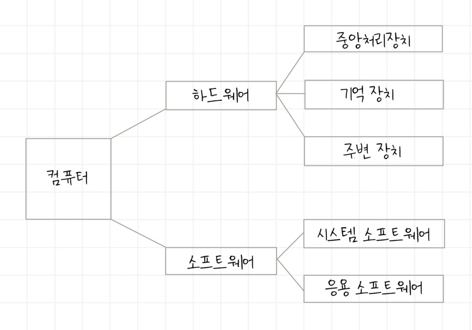 - 응용 소프트웨어 : 사용자가 업무 수행 = 엑셀, 워드, 엑세스, 포토샵 등